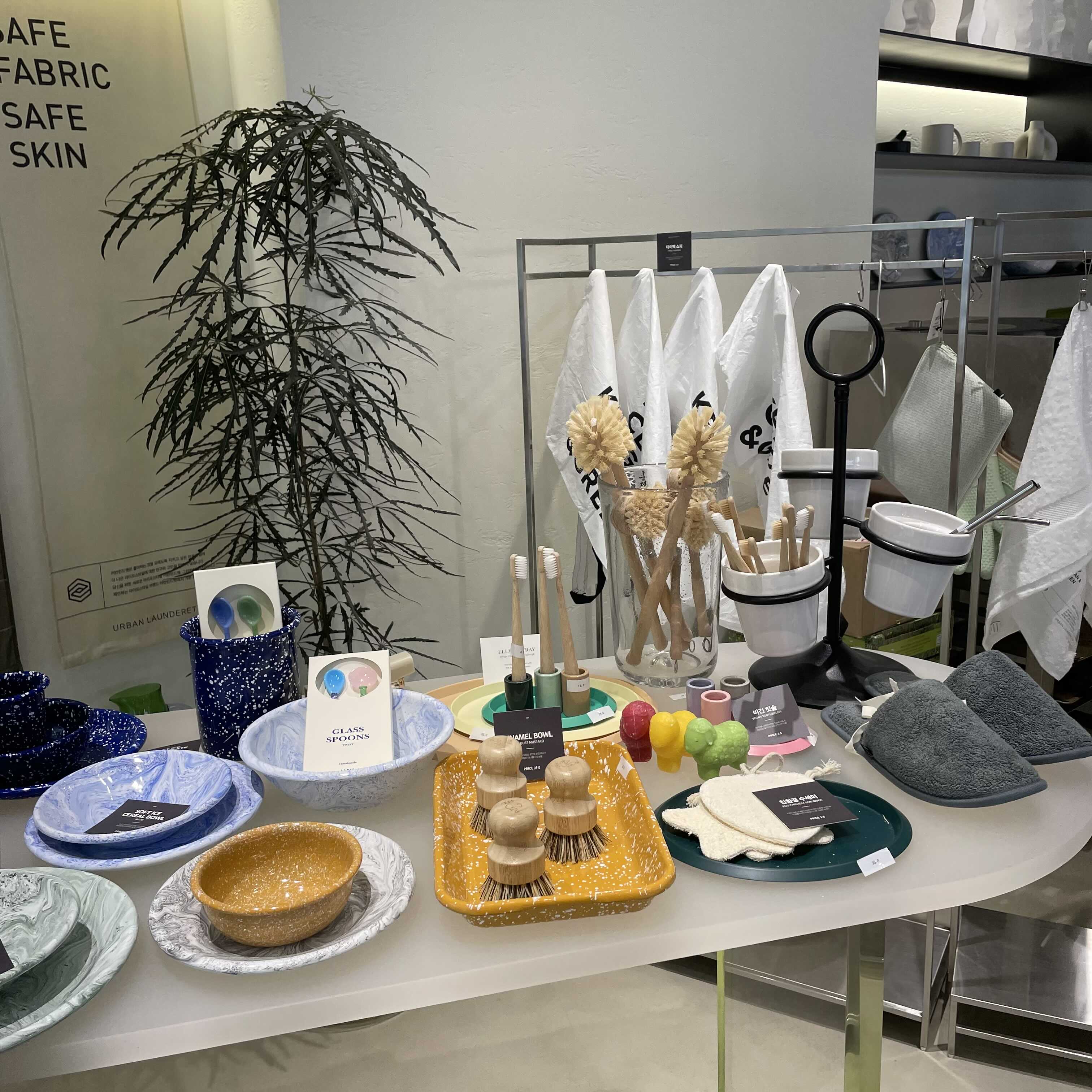 친환경 칫솔과 수세미, 다양한 그릇이