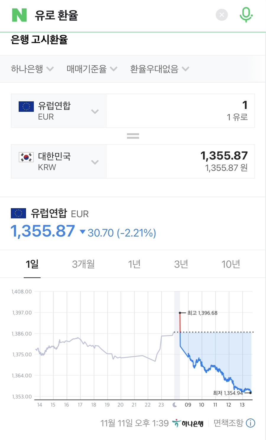 네이버에 유로 환율을 쳐보니 1355..?