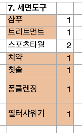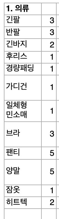속옷은 3개면 될 것 같다. 어차피 손세탁해서 입어야 하므로.. 최대한 줄이는게 좋다.